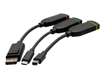 | Inkluderad kvantitet x Typ | Videokabel - 19 pin HDMI typ A (hane) till 19 pin HDMI typ A (hane), 1.8 m Videokort - 20-stifts DisplayPort (hane) till 19 pin HDMI typ A (hona) Videokort - Mini DisplayPort (hane) till 19 pin HDMI typ A (hona) Videokort - 24-stifts USB-C (hane) till 19 pin HDMI typ A (hona) |