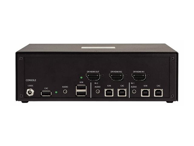 | Gränssnitt | 2 x DisplayPort/HDMI-ingång hona 2 x CAC-ingång Type B common access card (CAC) 2 x tangentbord/mus Type B 2 x ljudinmatning telefon stereo 3,5 mm hona 1 x DisplayPort/HDMI-utgång 2 x tangentbord/mus Type A 1 x ljudutmatning telefon stereo 3,5 mm 1 x USB-utgång Type A vanlig åtkomstkort (CAC), för användare |