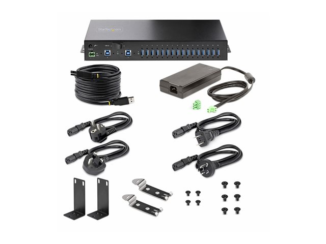 StarTech.com 16-Port Industrial USB 5Gbps Hub with Power Adapter, Metal Enclosure, Mountable, ESD Protection, Terminal Block Power, USB Charging, Dual-Host Switch - TAA - Hubb - 16 x USB 3.2 Gen 1 - skrivbordsmodell, rackmonterbar, DIN-skenmonterbar, väggmonterbar - TAA-kompatibel