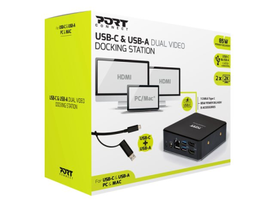 PORT Designs USB-C & USB-A Dual Video Docking Station 2 X 2K erbjuder mångsidiga anslutningsmöjligheter för moderna användare. Med gränssnitt för ljud, nätverk och video underlättar denna dockningsstation sömlösa dataöverföringar och inställningar med flera skärmar. Den har två HDMI-portar som möjliggör dubbel 2K-videoutgång, vilket ökar produktiviteten genom konfigurationer med dubbla skärmar.