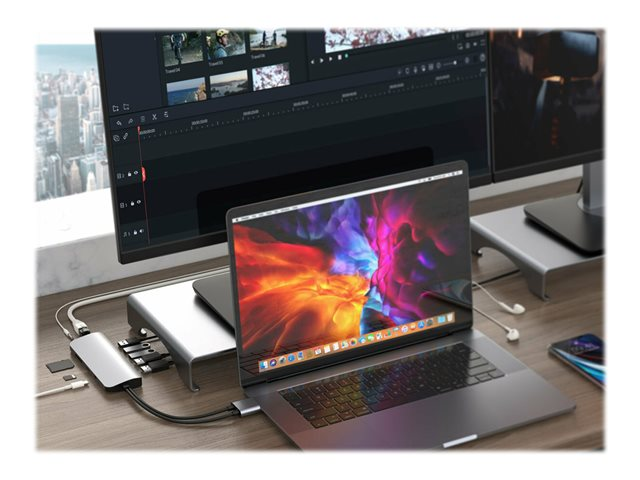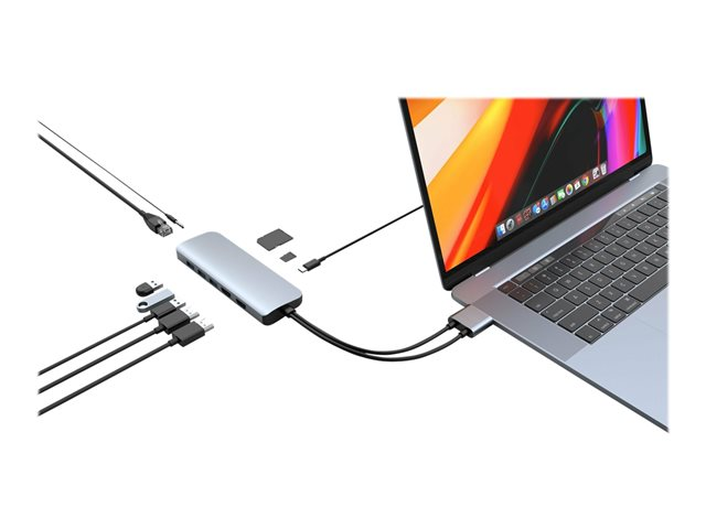 Universal USB-C hub for MacBook, Chromebook, and PC. This USB-C adapter adds 10 ports: dual 4K 60Hz HDMI output, USB-C power delivery, gigabit ethernet adapter, and more.
